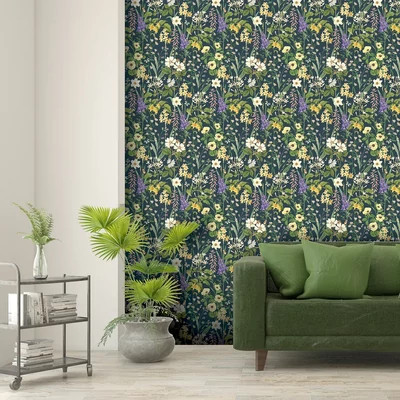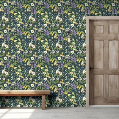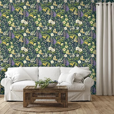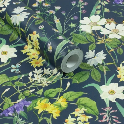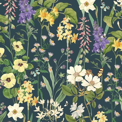 Nárcisz, árvácska, csillagjázmin, tátika virágos bohém tapéta színpompás pillangókkal és méhekkel