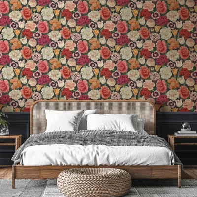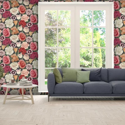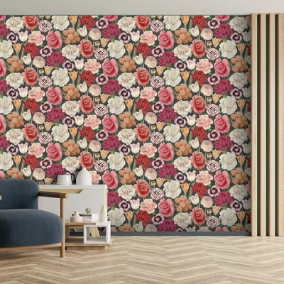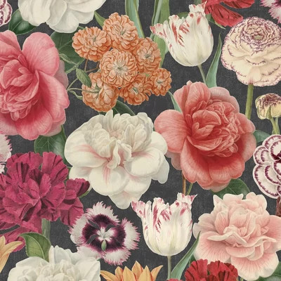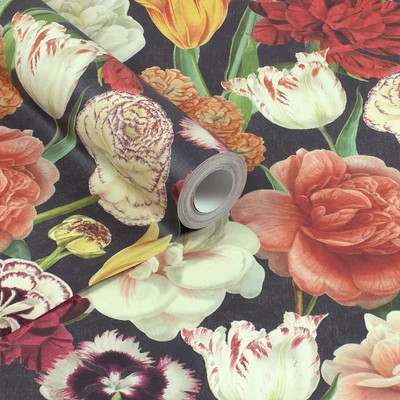 Élénk rózsa, szegfű, tulipán, bazsarózsa, boglárka mintás tapéta fekete alapszínnel
