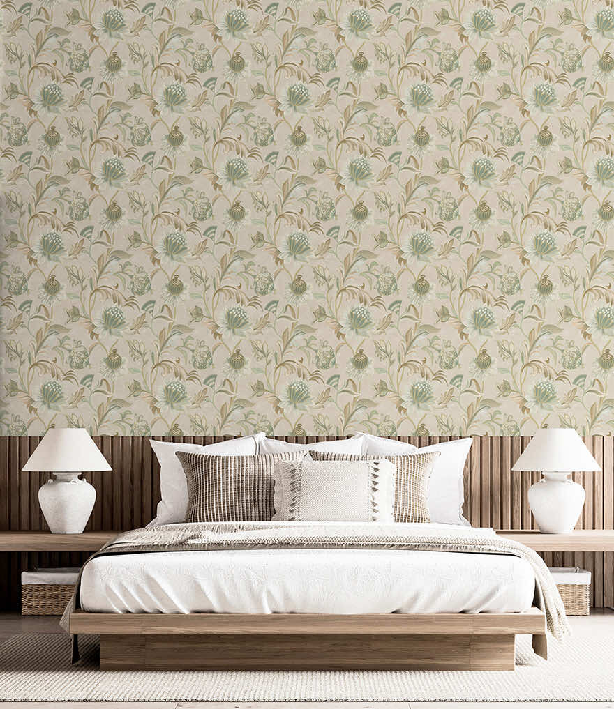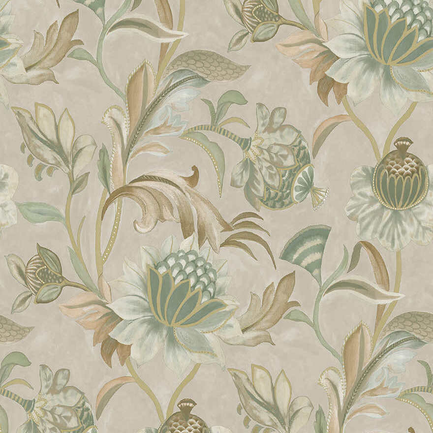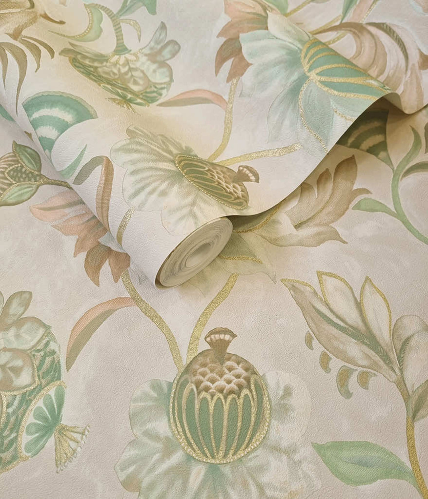 Zöld bézs natur virág mintás angol vidéki stílusú vinyl tapéta enyhén arannyal kontúrozva