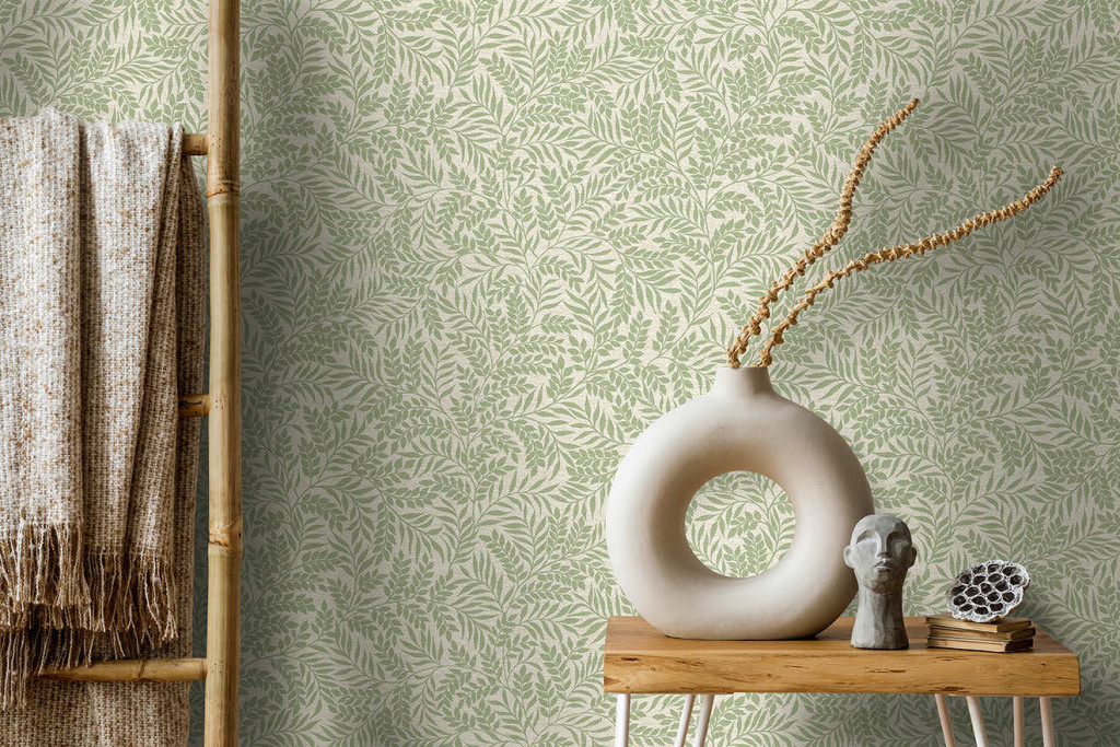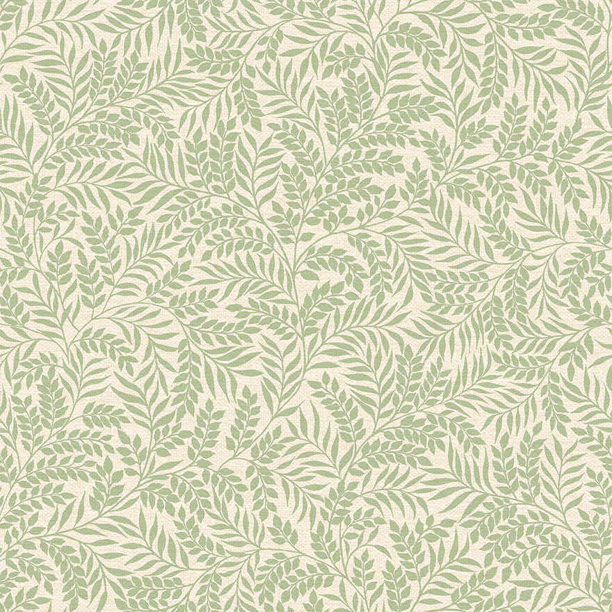 Bész alapon zsálya zöld színű apró levél és inda mintás angol stílusú vlies tapéta